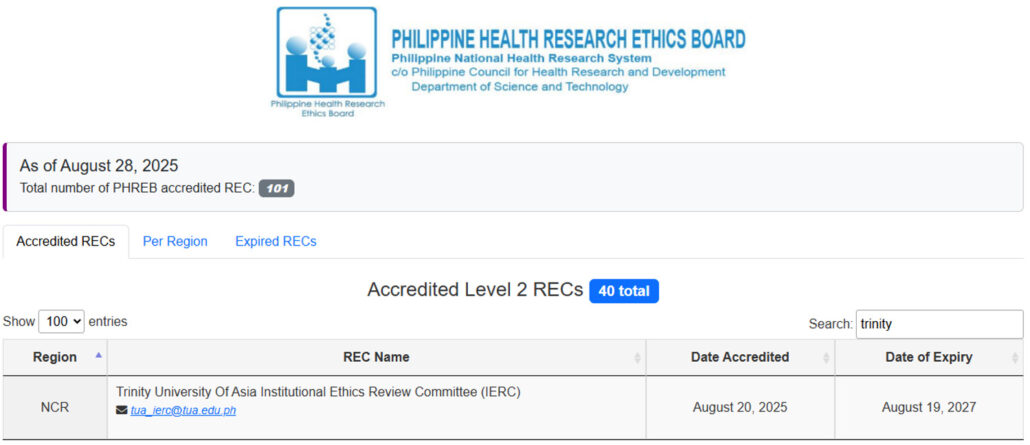Level 2 Accredited from August 20, 2025 until August 19, 2027 by the PHILIPPINE HEALTH RESEARCH ETHICS BOARD (PHREB)