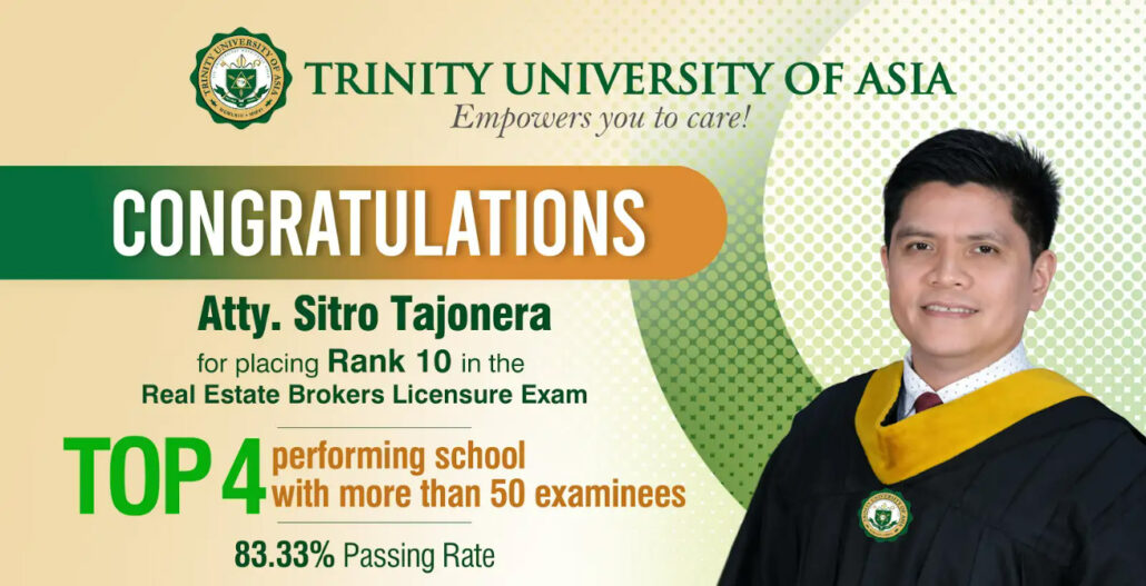 Trinity University of Asia, through the Institute of Business and Management – School of Real Estate Management (IBAM-SREM), ranked 4th among the Top Performing Schools in the April 2026 Real Estate Broker Licensure Examination. Mr. Sitro G. Tajonera placed 10th among the top examinees.
